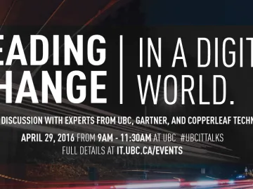 UBC IT will be hosting a presentation and panel discussion on "leading change in a digital world" on Friday, April 29, 2016 from 9:00am - 11:30am in the Pharmaceutical Sciences Building (Room 1101). The event will feature distinguished speakers from UBC, Gartner, and CopperLeaf Technologies who…